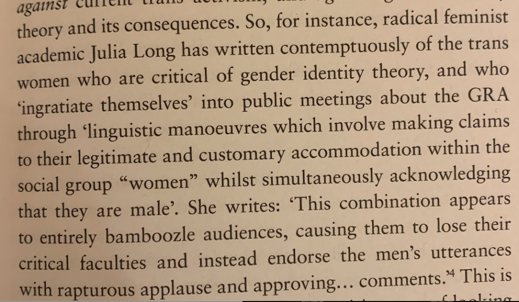 “Two things immediately struck me (about the book): firstly the wholly unnecessary and frankly curious use of the word ‘contemptuously’ to describe Dr Julia Long’s views. This is an unprofessional way to voice disagreement with a fellow academic, whose history of feminist activism and academic work is well-regarded. Yes, the focus was on Julia, but as a radical feminist activist who has long shared this position, I am included in this denouncement.