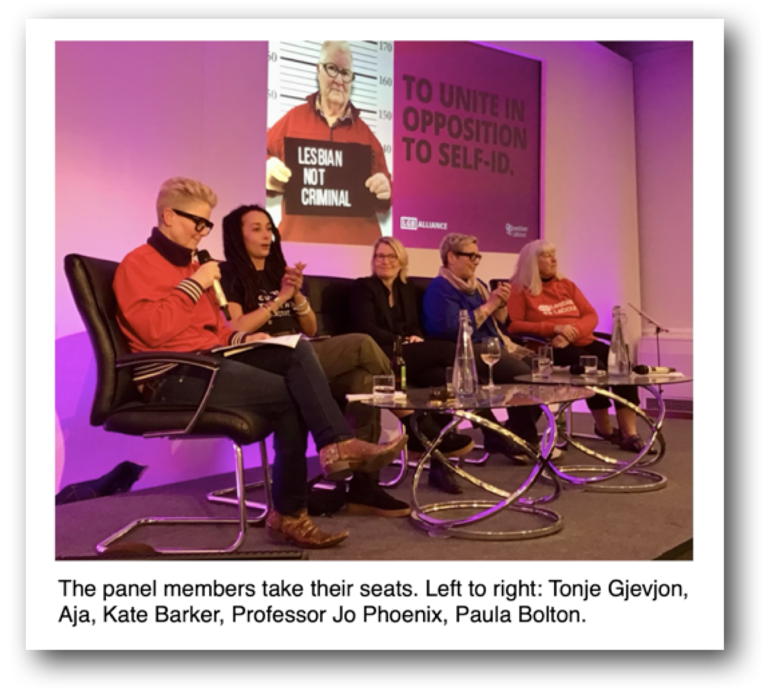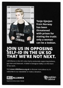 The LGB Alliance page for the event points out that we are in danger of going the same way as Norway, where self-ID was adopted in 2016. Self-ID “allow(s) any man to declare himself a woman and a lesbian.” Under self-ID law “it is considered prejudiced to say that a man cannot be a lesbian.”