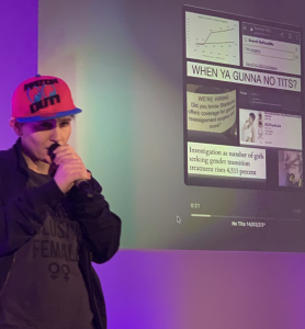 The final performance of the evening was from Trish. She rapped about gender politics, transitioning children, and lesbian erasure. I was sitting close to the speaker while she was performing; the music was louder than her voice so I couldn’t catch all her words.