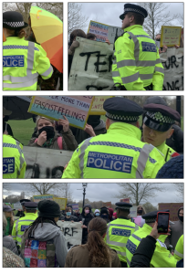 Torn between my own distrust of the police and wishing there were more of them, I looked around, trying to measure out in my head how much space we had, using the ‘one tall man lying down= 6ft’ method. I reckoned our cut-off circle was about 18ft across. There were about a hundred people, mostly women, inside the circle, and about a hundred TRAs outside.