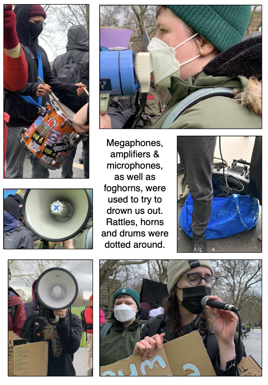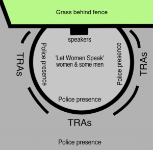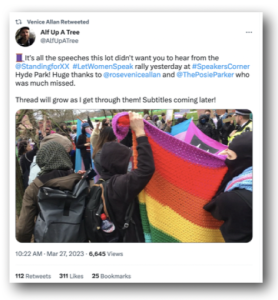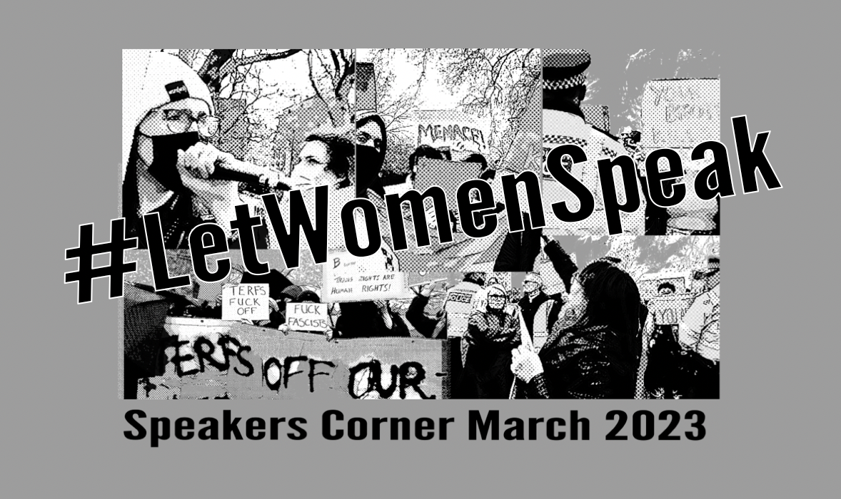 Well, here we are again, another chilly Sunday and another ‘Let Women Speak’ event menaced by TRAs. This time they brought along foghorns, megaphones and an amplifier, and I’d like to address that first of all. There’s a bylaw in the Royal Parks which states that amplification is not allowed. It makes sense really. On a busy day at Speaker’s Corner it would be impossible to hear a thing if all the speakers were amplified. Everyone else would just be immersed in a huge nonsensical cacophony of sound. Welcome to my Sunday afternoon, which was just that.