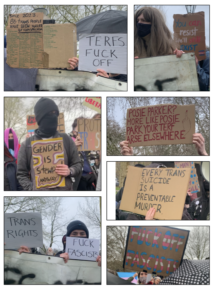 Why are my ears ringing? Because, for much of the time, I was one of the women trying to ensure the TRAs didn’t move in and kettle us in an even smaller space. The police insisted they’d got it, but a few of us stood in the bigger gaps so the women listening to the speakers could- theoretically-feel safer. Another women who had positioned herself to stop the TRAs moving closer was using a walking aid with a seat. She faced a group holding a tarpaulin with ‘TERFs off our turf- defend trans lives’ sprayed on it in black paint. A kid in a beanie and a mask, probably young enough to be her grandchild, held up a piece of cardboard in front of her. It said ‘Fuck Fascists‘. I looked over to my right. A TRA was screaming something about being on the right side of history.