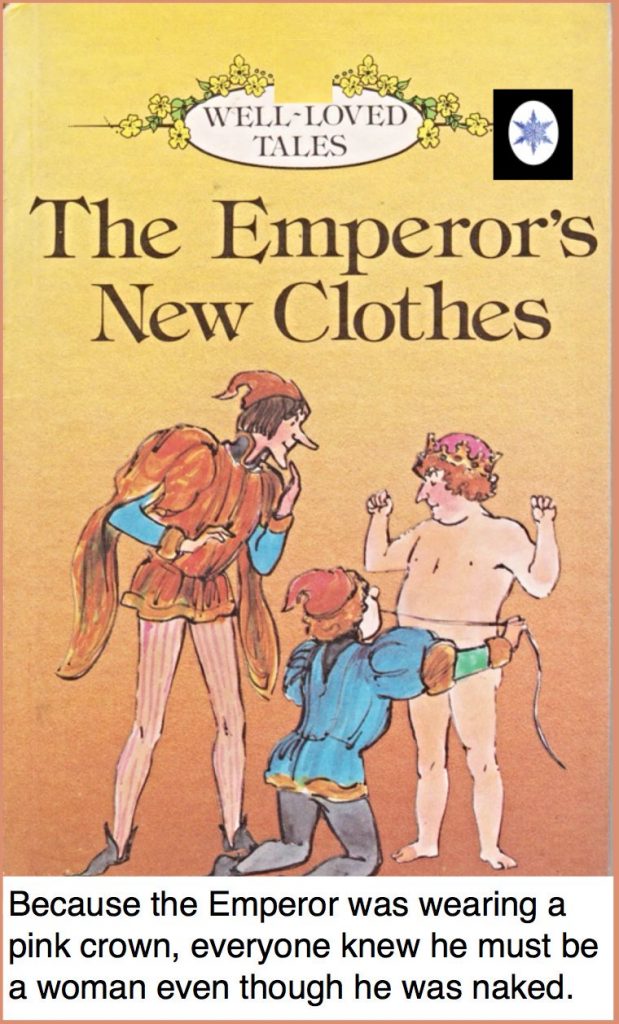 “What I find troubling,” said Heather, “is that the whole practice is riven with contradictions and we’re not allowed to even point the contradictions out! Strangely, society seems captured and reproduces the contradictions without reflecting on them… it’s utterly bizarre. That metaphor of the Emperor is very pertinent here…  the theory is naked, it has no substance to it, it’s completely illogical.