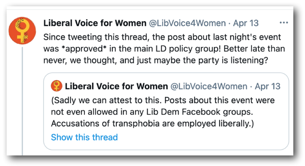 I’m not a Liberal Democrat, or a Conservative, or a whatever-it-is-that-people-in-the-Labour-party-call-themselves-these-days but, when there doesn’t seem to be a political party in the entire country willing to admit to knowing what a woman is, attending an event such as this seemed important. So on the evening of 12th April 2021, I attended a Zoom event organised by Liberal Voice for Women.
