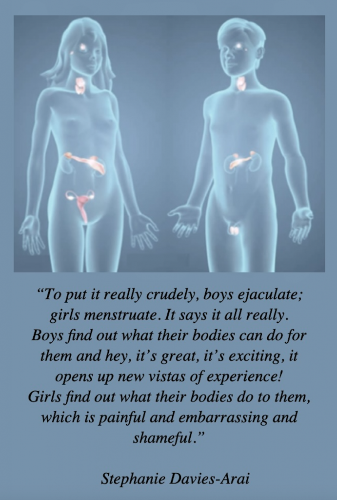 “To put it really crudely, boys ejaculate; girls menstruate. It says it all really. Boys find out what their bodies can do for them and hey, it’s great, it’s exciting, it opens up new vistas of experience. Girls find out what their bodies do to them, which is painful and embarrassing and shameful: you can’t talk about periods…  It’s a completely different experience.”
