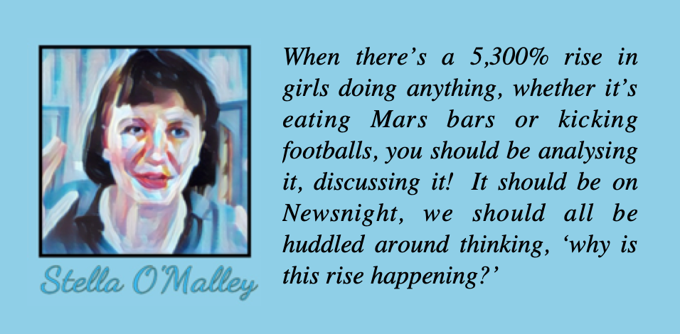 “The numbers are so insane,” she says, referring to the huge increase in kids presenting to GIDS at the Tavistock over the last decade, the majority of whom are girls, “that you can’t get your head around it. When there’s a 5,300% rise in girls doing anything, whether it’s eating Mars bars or kicking footballs, you should be analysing it, discussing it!  It should be on Newsnight, we should all be huddled around thinking about ‘why is this rise happening?’.  And instead the debate is being shut down.”