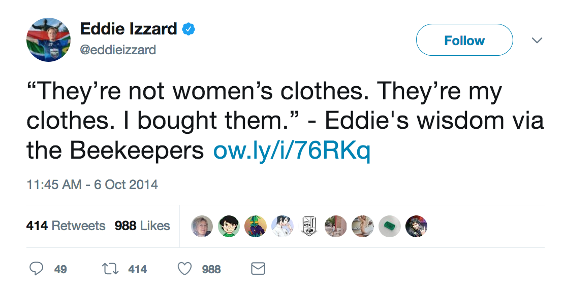 As recently as 2014 Eddie was proud to be ‘a man in a dress’, tweeting:
