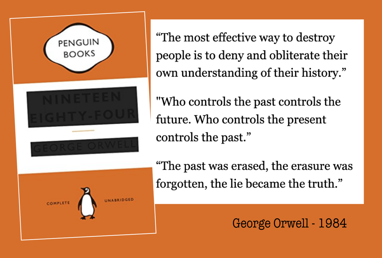 “Every record has been destroyed or falsified, every book rewritten, every picture has been repainted, every statue and street building has been renamed, every date has been altered. And the process is continuing day by day and minute by minute. History has stopped. Nothing exists except an endless present in which the Party is always right.”