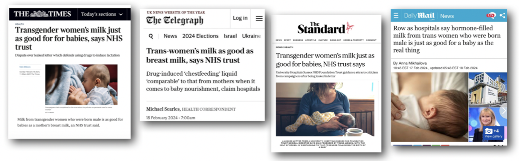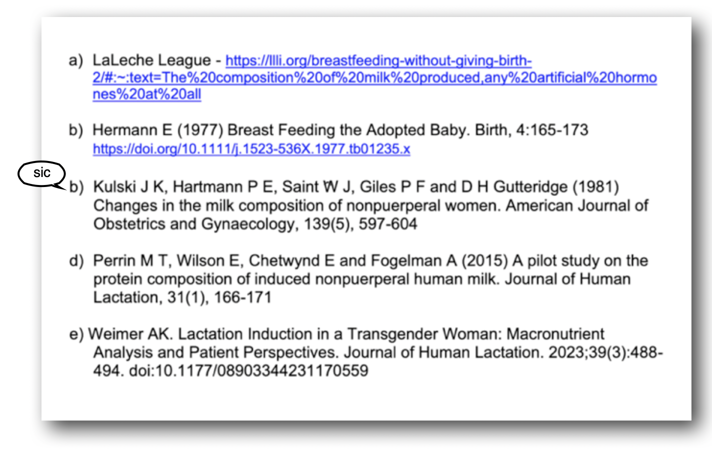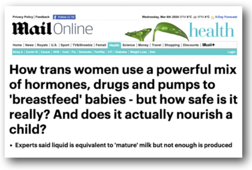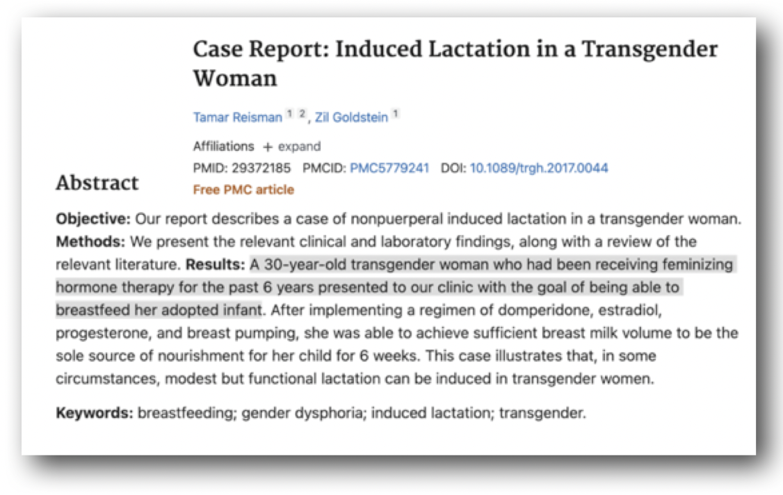 The 2023 ‘study’ cited in the letter, that of a trans-identified man who had a pregant partner ‘not interested in breastfeeding’ was titled ‘Experience of Induced Lactation in a Transgender Woman: Analysis of Human Milk and a Suggested Protocol’ can be read in brief here.