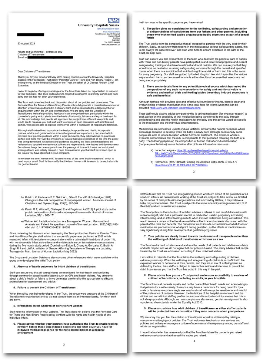 In May 2023, Children of Transitioners wrote to University Hospital Sussex NHS Foundation Trust, expressing concerns about their ‘Perinatal Care for Trans and Non-binary people’ policy.