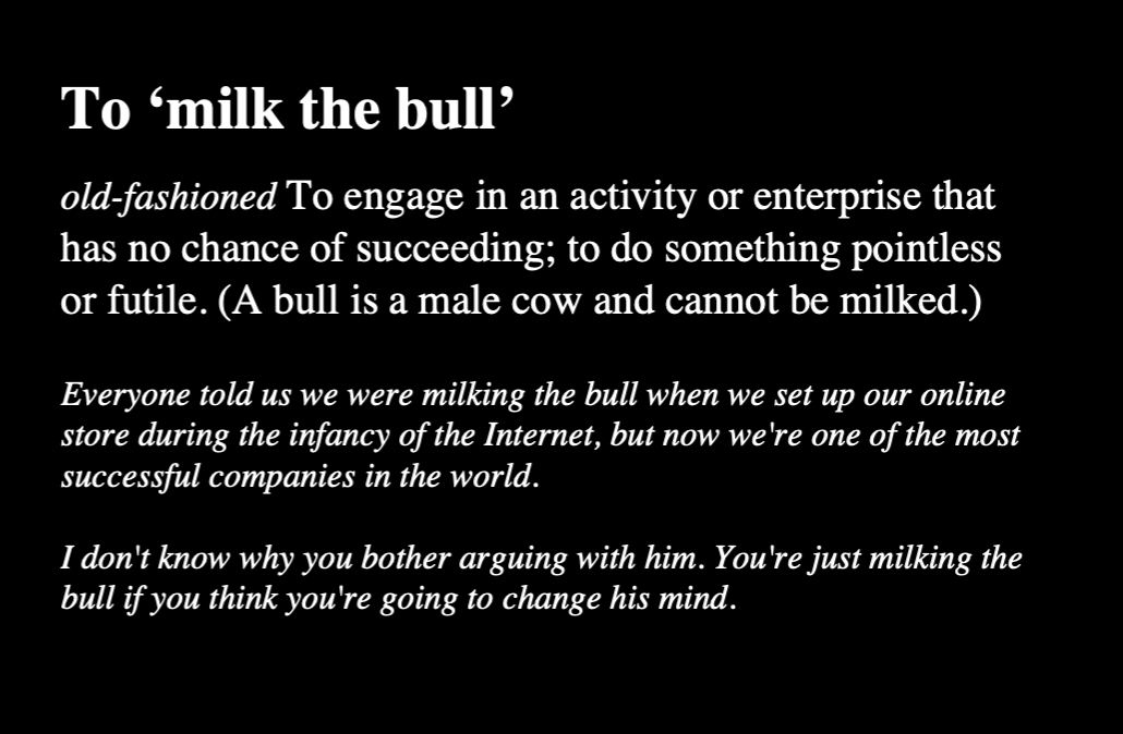 Incidentally, ‘milking the bull’ is an old-fashioned saying which uses the metaphor to indicate “an activity or enterprise that has no chance of succeeding; to do something pointless and futile.”