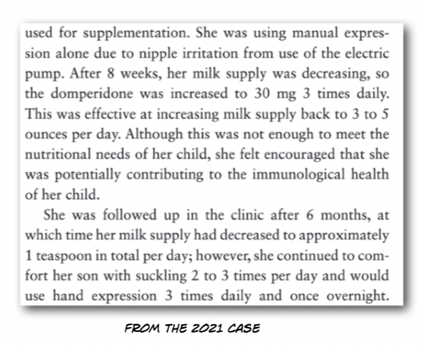 Shirley pointed out that when they say (in the letter) “’here is clear and overwhelming evidence that human milk is the ideal food for infants’, they are taking research that was done on female-produced milk and claiming that that also applies to milk produced by males. And I almost can’t believe I’m saying these words…”