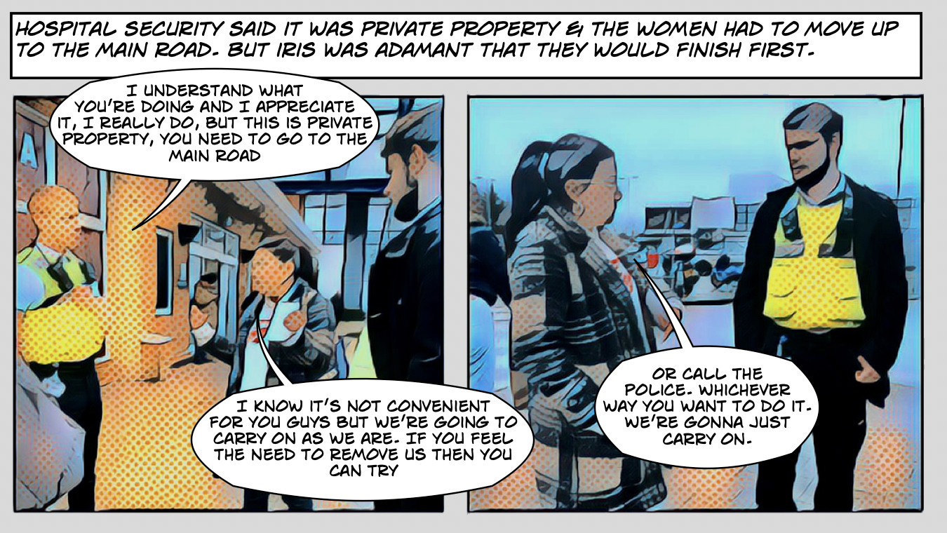 “The reason we are here at this hospital is because the board members are holding a meeting over there now,” Iris told the livestream. “What we would have really liked was for them to hear us but this is the closest we can get and hopefully it will get back to them that we are here and why we are here.”