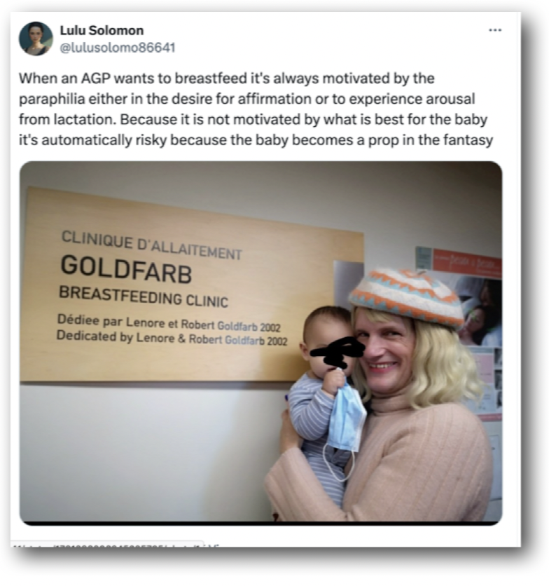 It’s important to clarify that men cannot breastfeed babies… I implore each and every one of you to join me in speaking out against this insanity. Let us not allow the essence of motherhood to be diluted or distorted by misguided ideologies. Together, let us uphold the dignity and respect owed to all mothers, past, present, and future. Our babies are not a commodity or accessory, nor are they there to affirm mental illness and a man’s sexual festish.”