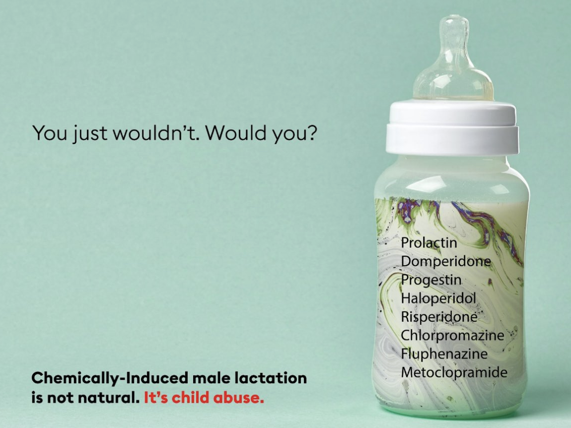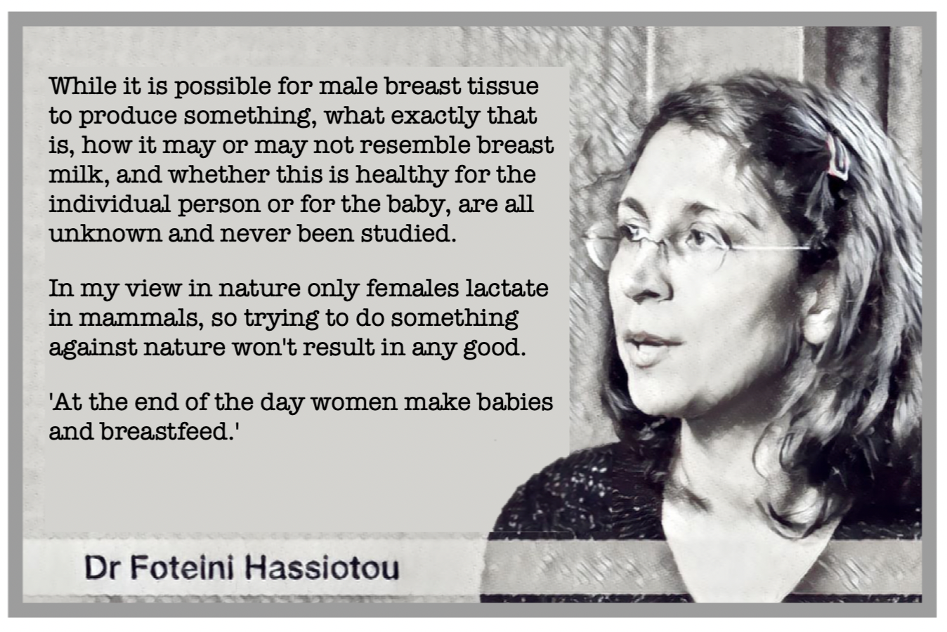 This is very interesting but has absolutely nothing whatsoever to do with enabling men to produce nipple secretions, via a cocktail of drugs and hormones, so they can pretend they are breast-feeding mothers. If that doesn’t come under the umbrella of the ‘inappropriate marketing of breast milk substitutes’ that the WHO professes to be concerned about, then I don’t know what does.