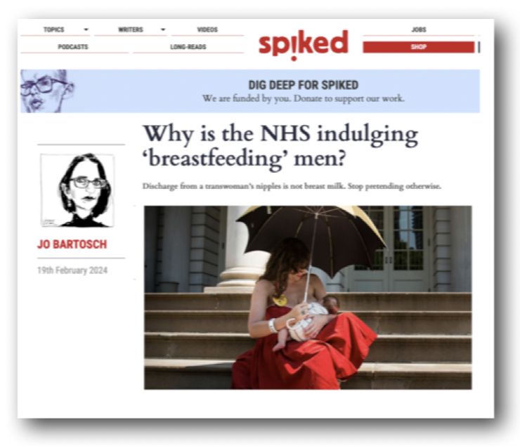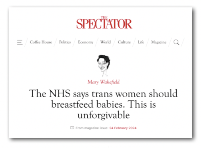 “They’ve spent furtive years fossicking about in their wives’ knicker drawers and a small fortune on hormones and often unspeakable surgery. From what I can gather, they fancy breastfeeding because they crave ever more definitive female experiences, chasing a feeling of final validation which recedes, like a mirage, as they approach.” wrote Mary Wakefield in the Spectator.