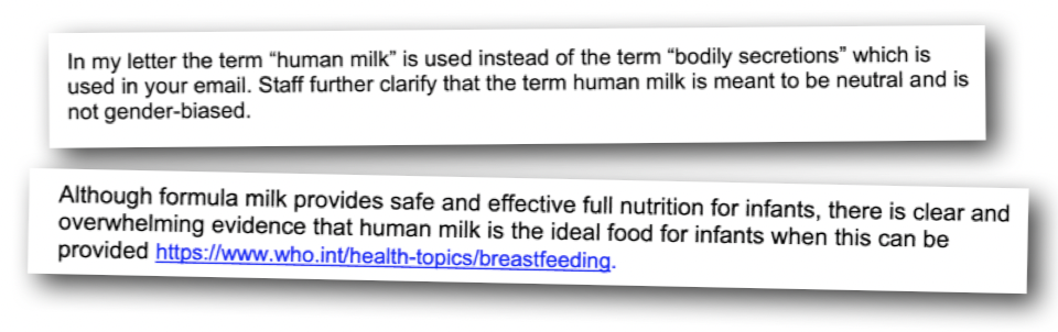 “In my letter the term ‘human milk’ is used instead of ‘bodily secretions’ which is used in your email. Staff further clarify that the term ‘human milk’ is meant to be neutral and is not gender-biased.”
