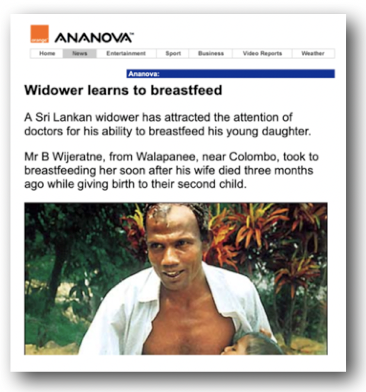In 2002, IOL published a short article about Sri Lankan widower B Wijeratne, who claimed he was able to breastfeed his 18 month-old daughter after her mother died in childbirth. The article is often misreported as clamining he was able to exclusively feed the newborn, or both children.