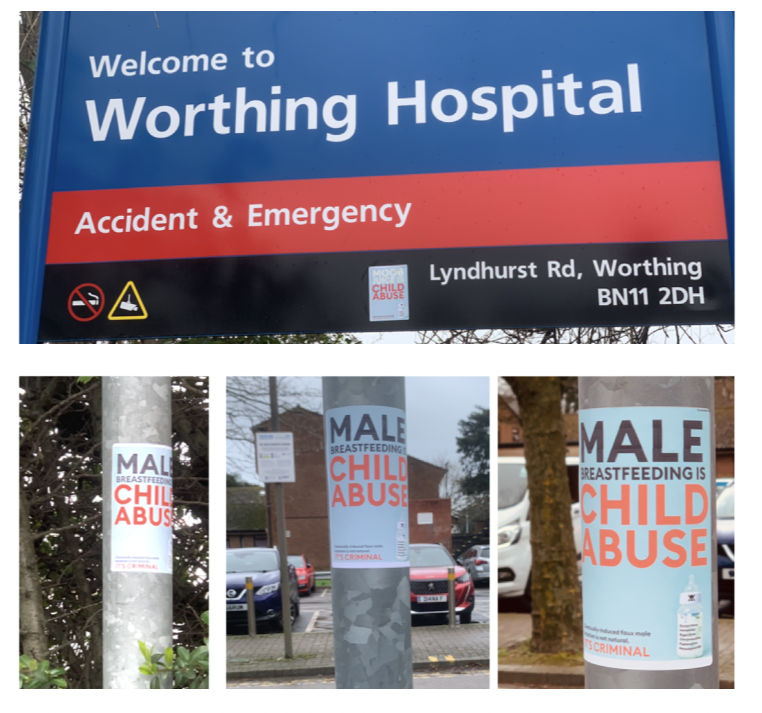 “Hi everyone, we’re outside Worthing hospital and we are here to let the users of Worthing Hospital University Trust know that their board members endorse men feeding babies their… what would you call it?… their secretions,” announced Iris. “And the outrageous claim that men can chestfeed.”