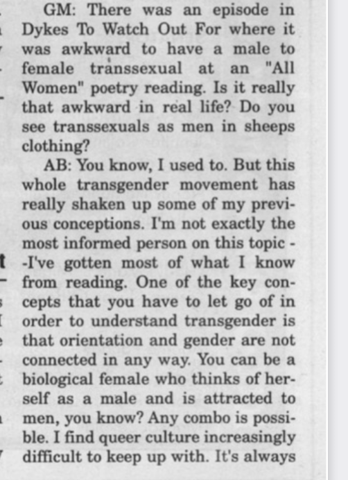Whiny, tedious moaning from another straight. What a gross disservice to Bechdel’s work to reduce her to a single cartoon about lesbians in film that came to be misappropriated by straight liberal media consumers in 2012. Your flop tweet that you screenshotted reads like a parody of the “trans activists” you’re so afraid of, agonizing over perfectly innocuous and natural language that doesn’t do enough to protect your own personal sense of identity.