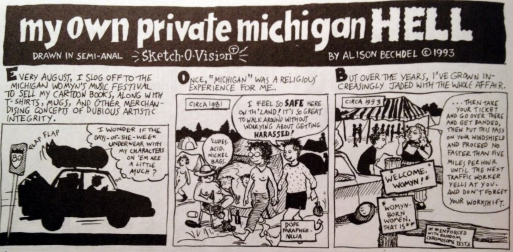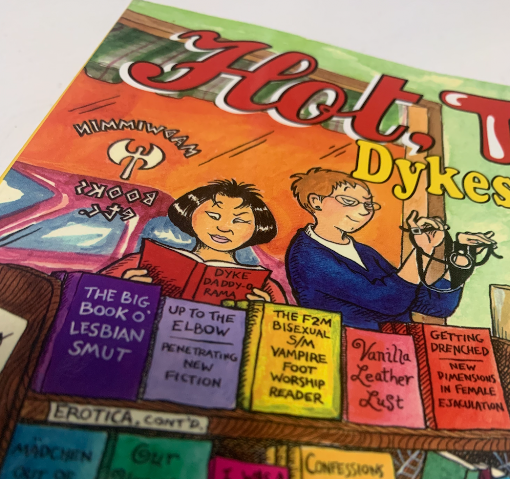 I’ve always admired your work. I had a copy of Dykes to Watch Out For in my squat in the late 80s. My family collects graphic novels & comic books: Hot Throbbing Dykes to Watch Out For sits between Castle Waiting and Persepolis on a shelf on my upstairs bookcase. My young adult daughter, a lesbian, has copies of your books strewn around her room.