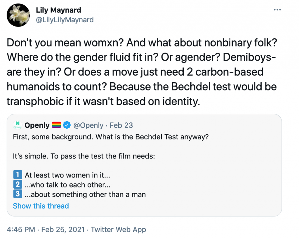 I was literally just talking about the Bechdel test this morning. Of course you’re right, it is meaningless if she means womxn, rather than women.