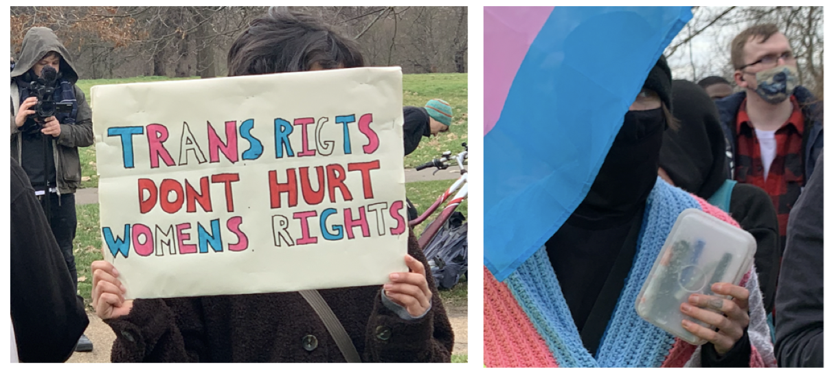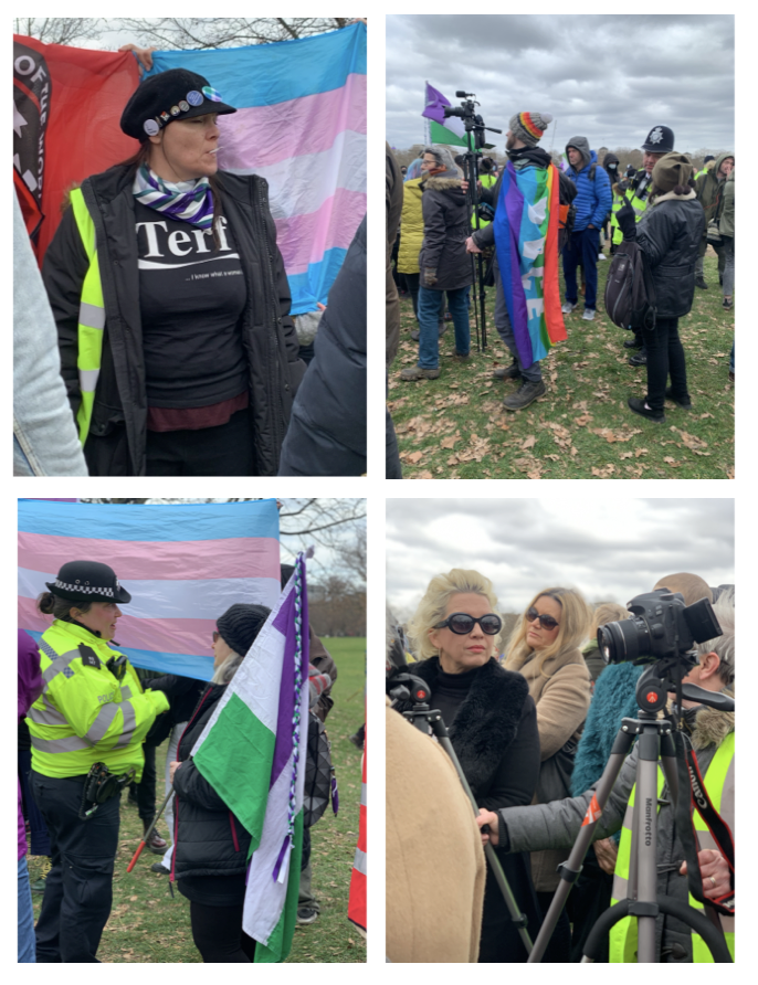 tand up on a nearby bin to get a decent overhead shot, but reader, I confess, I was afraid to do either of those things. The bin I considered standing on was on the opposite side to most of the TRAs but a small group of people in black stood close by. I overheard one policeman say “Keep an eye on that lot” to another, and the woman next to me informed me that one of them was the man who’d thrown water over Kellie-Jay two months ago.