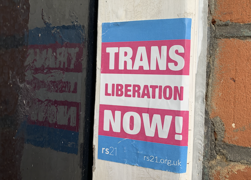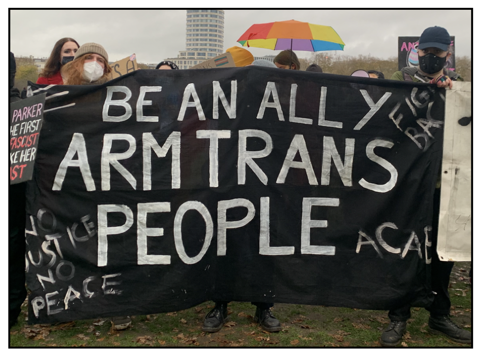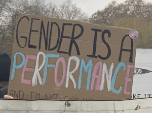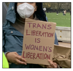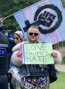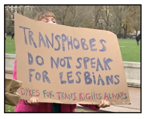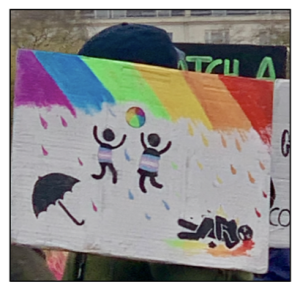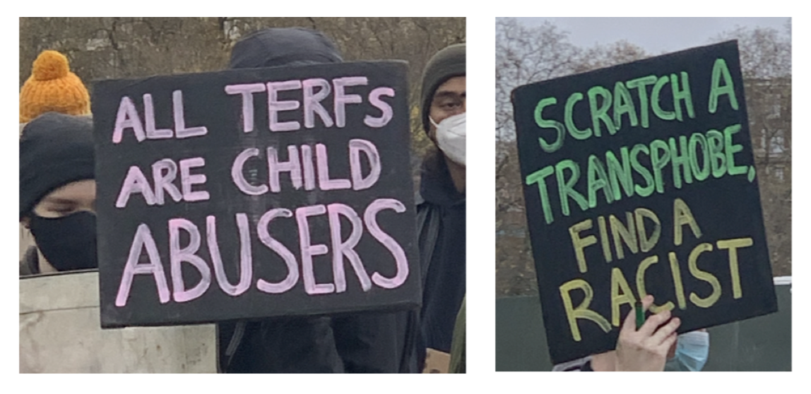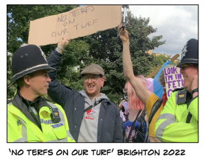 In Brighton in 2022, protest signs read ‘hate is not a protected right’ and ‘combat TERF hate’, ‘love trumps hate’ and ‘love wins’.