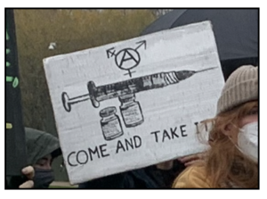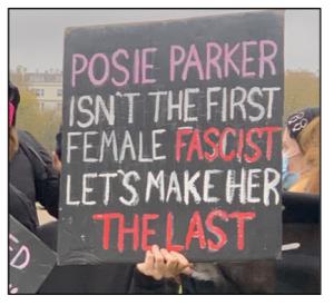This was the sign I found the most disturbing because- never mind the outlandish accusation- it seemed to be a direct incitement to violence. It was being held by a very young woman. Several women spoke to the police about it and were told different things. One told me an officer had said the sign shouldn’t be allowed but they were currently too busy to do anything about it. Another said she had been told it was fine.