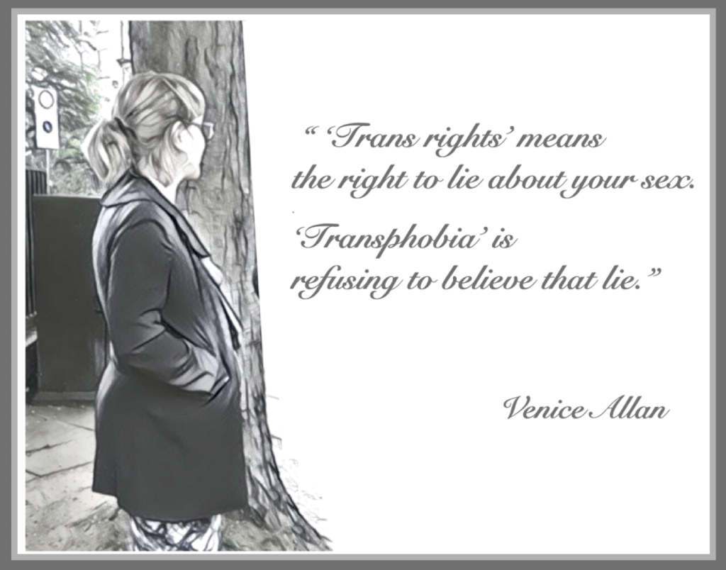 Venice Allan put it very well a few years ago, when she said, “‘Trans rights’ means the right to lie about your sex. ‘Transphobia’ is the refusal to believe that lie.”