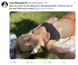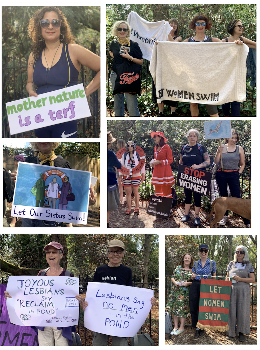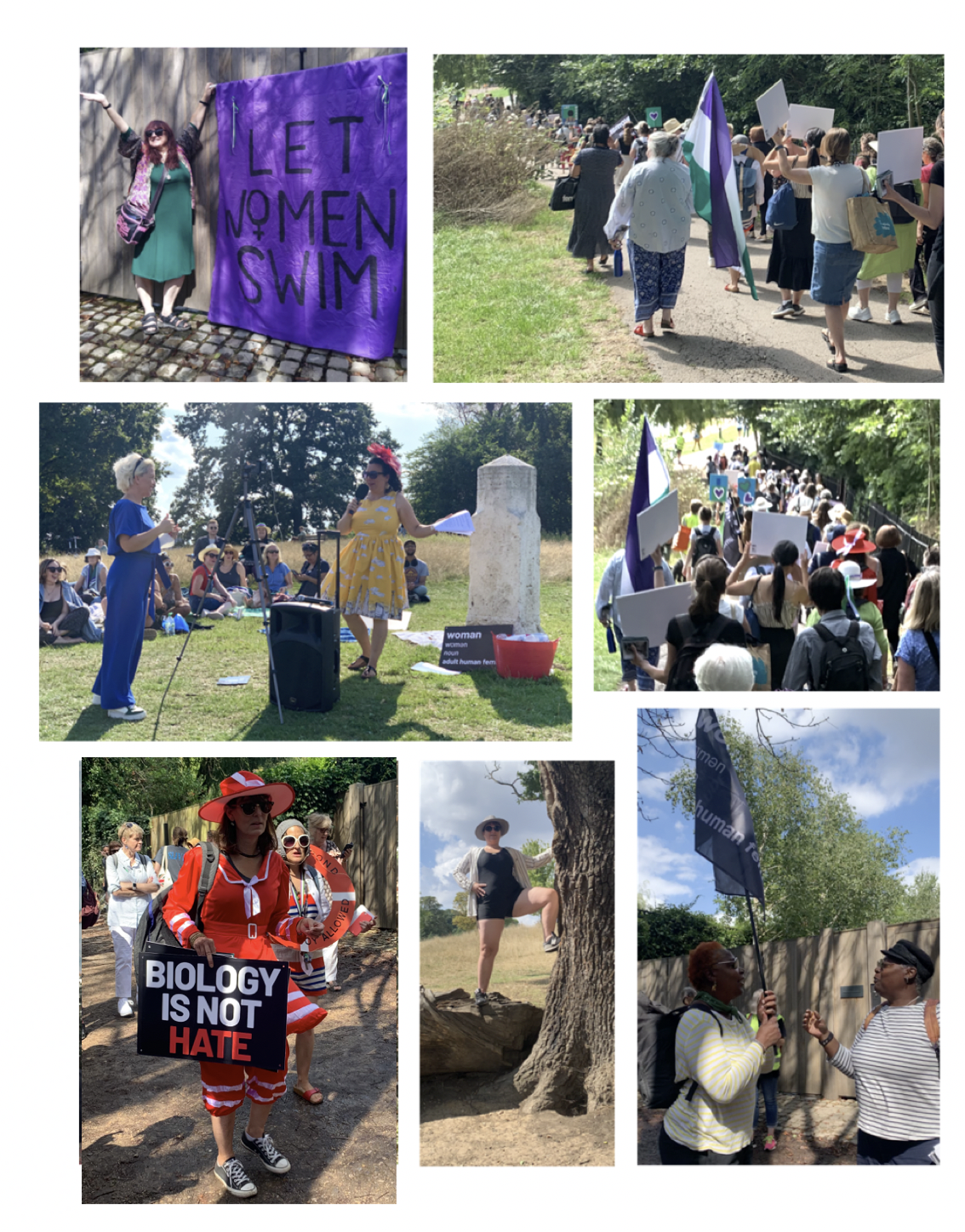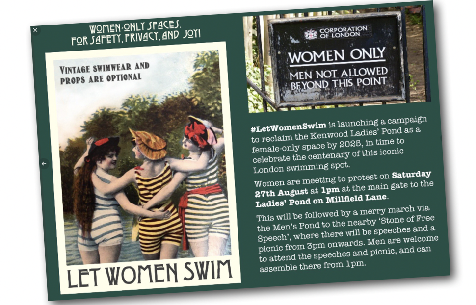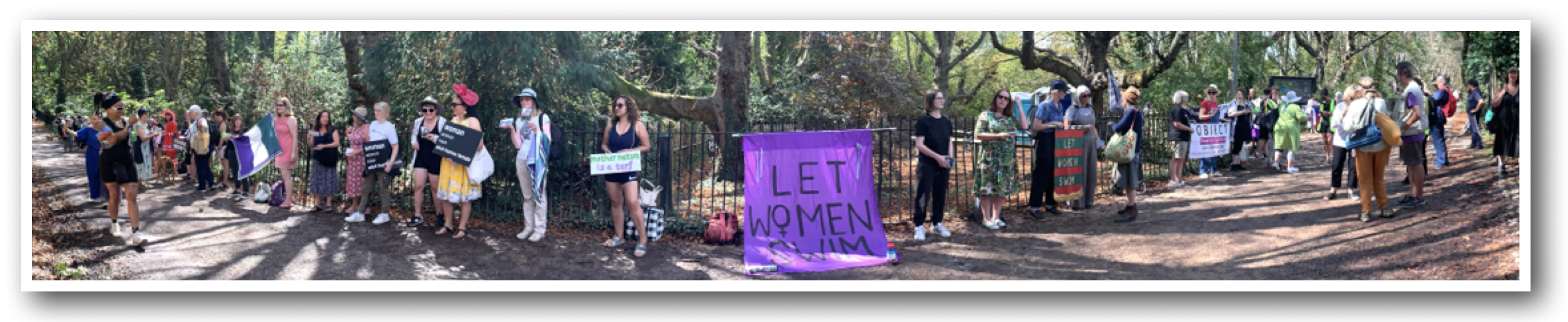 It was back in 2018 that Man Friday organised the first women’s protest at the ponds on Hampstead Heath. On that occassion a group of women chose to swim in the men’s pond in an attempt to draw attention to the absurdity of self-ID and the City of London’s new ‘trans inclusion’ policy concerning the use of the ponds. The men didn’t like it much- which rather proved our point about single sex spaces being desirable for both sexes- and pictures and videos of Amy in her neon-green mankini and other women sporting beards and swim trunks kept the press interested for a few days. You can read the piece I wrote about that sunny day, ‘Yes, but today is Monday’,