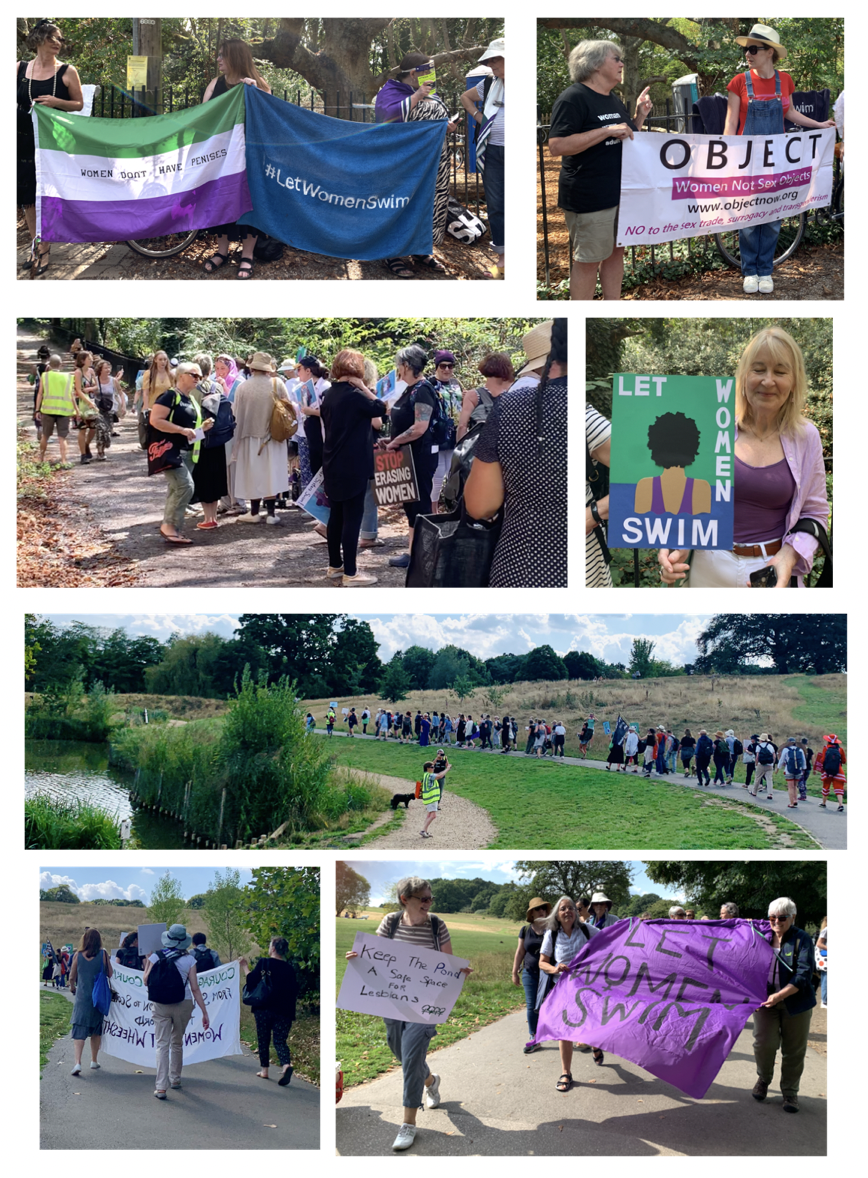 Some women sang and danced around or waved flags or handed out postcards to passers by. One couple gave theirs back saying ‘we don’t want them’. Many of those out for a stroll were curious about the reason behind the protest. l could see and hear conversations going on around me; several people were nodding, agreeing with the idea that single-sex spaces were essential or surprised to discover that all a man had to do to gain access to the Ladies’ Pond was to declare himself a woman. One young woman shouted ‘You’re disgusting’ and gave us the finger as she walked past.