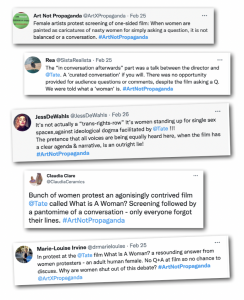 While Umansky had no warning about the protest and was not to know that it was specifically concerned with the Tate’s refusal to platform ideas concerned with women’s single sex spaces and rights, this claim seems astonishingly naive if not willfully ignorant. She couldn’t find a single voice that wasn’t heard in the film?