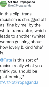 “Tate,” asks Art Not Propaganda. “Is this sort of racism really what you think you should be platforming?”