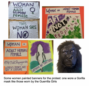 “An adult human female!” replied the others, in unison. “Art without freedom of speech is propaganda!” They stood there a moment, banners aloft, and then turned and walked up the steps to the left of the screen and out of the cinema.