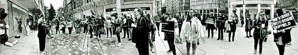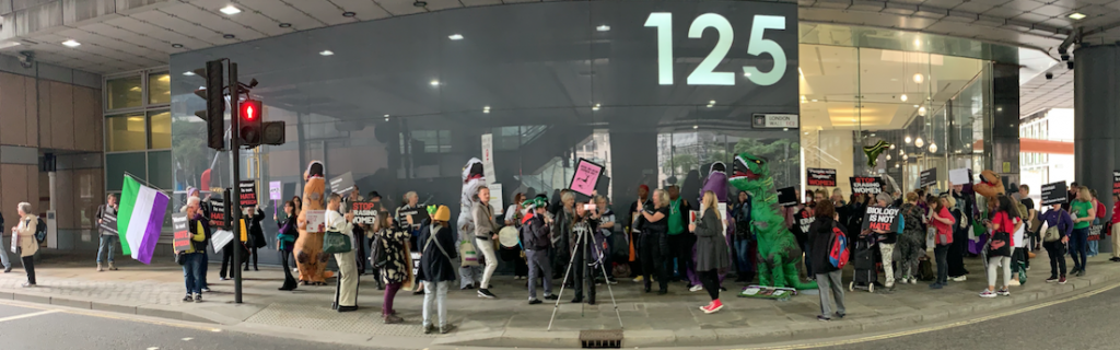 The Lancet HQ is on the corner of a busy junction in the city. Most of us stood outside the main building, with others scattered on the corners of the junction and on the other side of the crossing you see here. You can see some of the livestream here on Posie’s YouTube Channel.