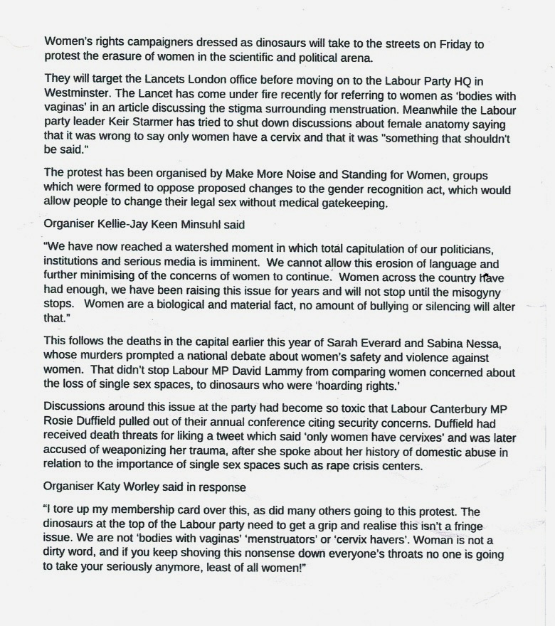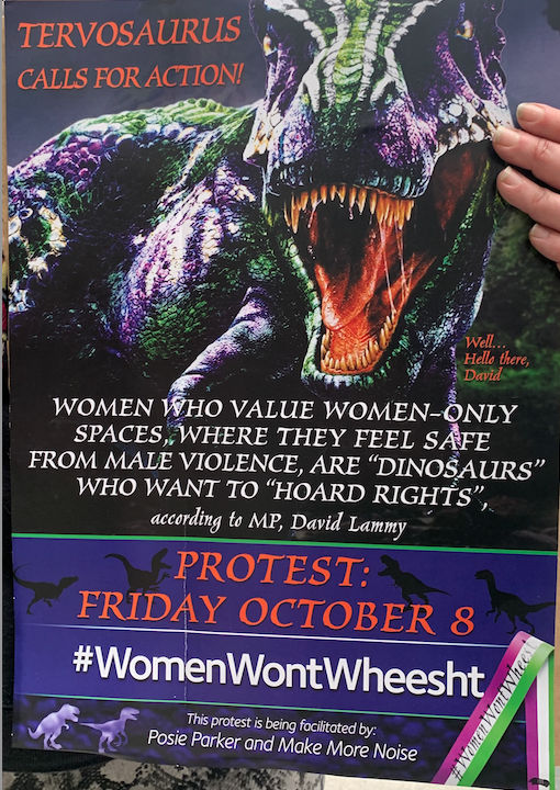 “Women who value women-only spaces, where they feel safe from male violence, are ‘dinosaurs’ who want to ‘hoard rights’ according to MP David Lammy. Protest, Friday October 8th. #WomenWontWheesht. This protest is being facilitated by Posie Parker and Make More Noise.”