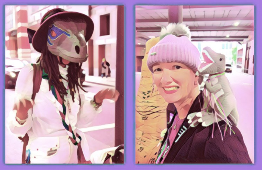Dinosaurs sporting the colours of the suffragette flag pose for a photo in the square with Posie