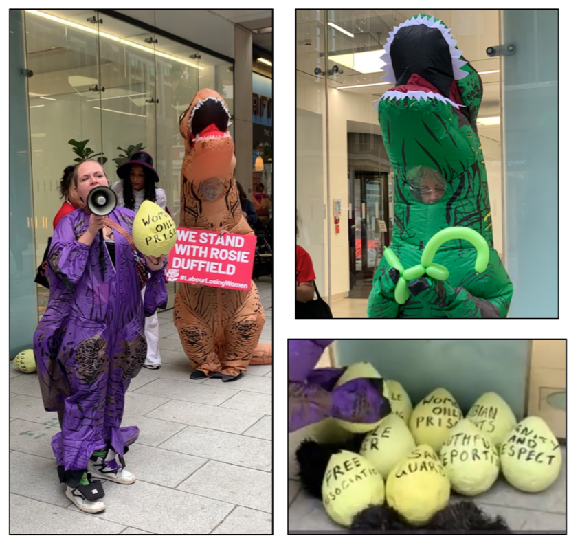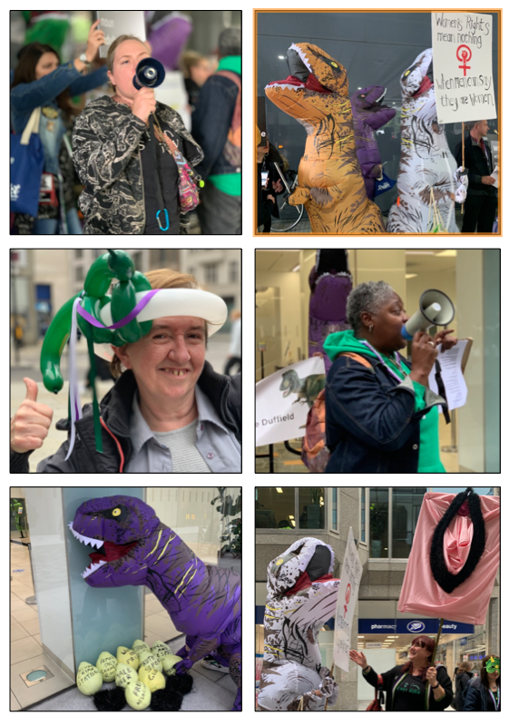 hoard?’ Well, a dinosaur hoards eggs! so I just thought I’d use it. Each egg has a different right that women are losing: there’s lesbian rights for example: lesbians are now not allowed to define themselves as same-sex attracted and neither are gay men. Then we’ve got female only changing rooms: if you’ve heard about the Wii Spa incident you can see the problems caused by current legislation. Women only prisons: men have been transferred to women’s prisons- rapists and sex offenders and dangerous sexual predators in some cases. They should not be in the female estate. Accurate crime statistics: so if you’re allowed to self-identify yourself when you commit a crime then loads of rapists are identifying as women and that’s skewing the crime statistics. I’m gonna do a little speech about it all in a minute…”