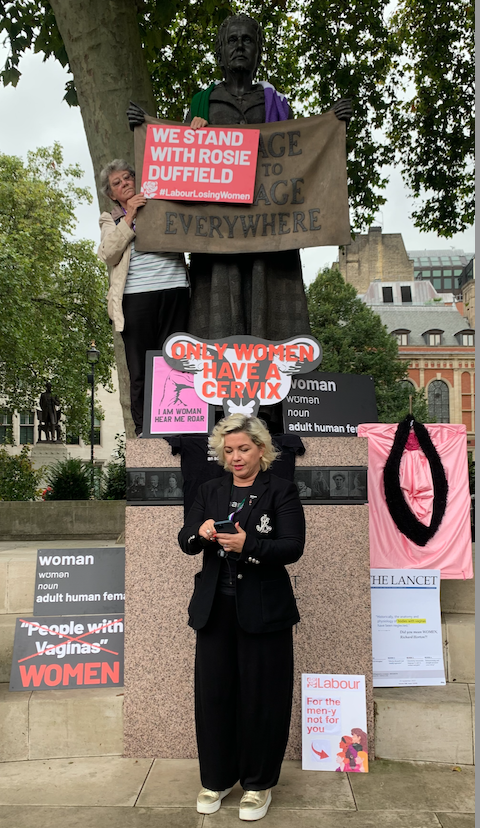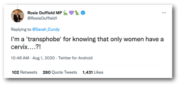 In August, Labour MP Rosie Duffield became embroiled in the cervix wars after ‘liking’ a tweet. Yes, there really are people who trawl Twitter, checking which Tweets certain people have ‘liked’- behaviour which TBH makes walking round London in an inflatable dinosaur suit chanting “only women have cervixes” look like positively pedestrian behaviour.