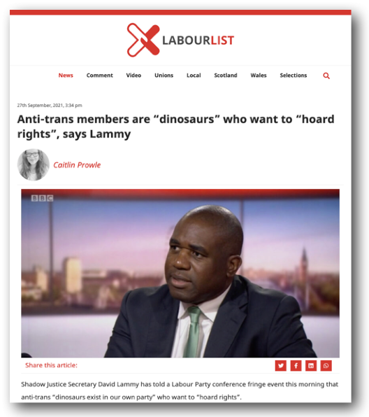 Lammy’s speech, which I’ve still been unable to track down in its full glory, referred to ‘anti-trans members’ of the Labour Party, rather than specifically referring to or naming women, although of course the recent demonisation of Rosie Dufflield may spring to mind (more on that later).