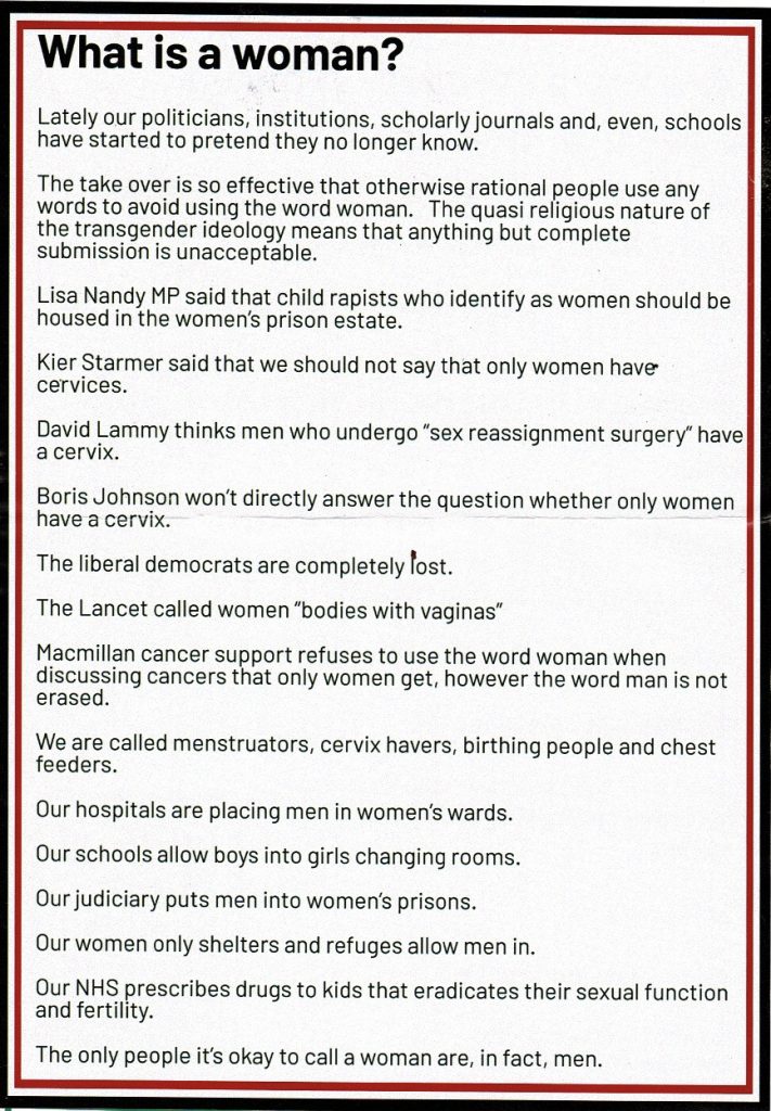 “Over there in those lovely Victorian buildings,” Posie gestured towards the Houses of Parliament, “Parliamentarians refuse to say a woman is an adult human female.”
