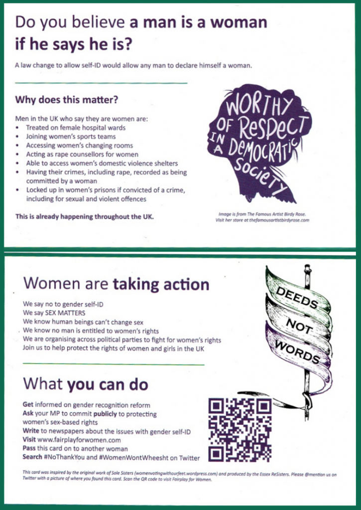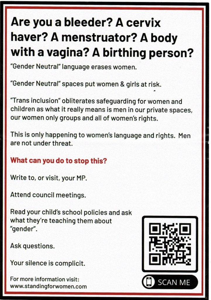 The protestors handed out two types of leaflet. The larger of the two was from Standing for Women, a double-sided A5 sheet like this: