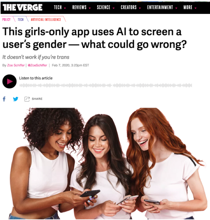 “This girls-only app uses AI to screen a user’s gender” scoffed The Verge. “What could go wrong?”