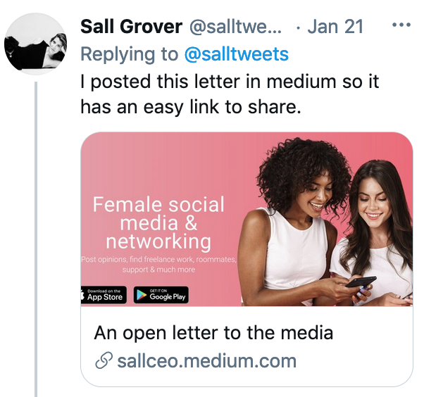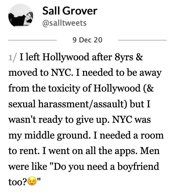“I created Giggle because I wanted women to have a “refuge” away from misogyny.” tweeted Grover, later that year. “I’d spent years in Hollywood being sexually abused. I knew my life would be better with an easily accessible female support network. I needed one. I knew I wasn’t the only one. So I created one.”