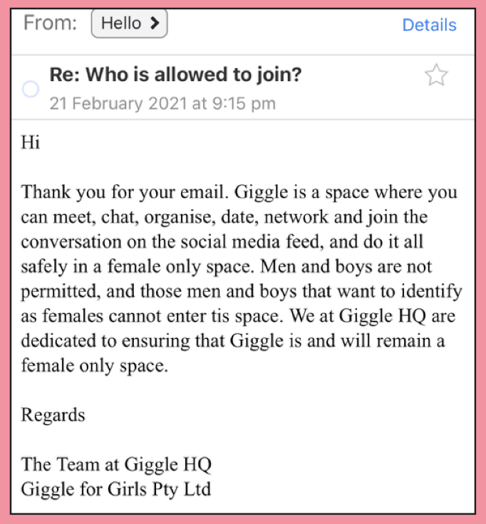 “Trans-girls are 100% welcome on giggle. Giggle’s “gender verification” onboarding process is a gatekeeper to stop men from getting on to the platform, not girls or those who identity as girls. If you are at all concerned with the possibility of being misgendered, you are welcome to contact giggle HQ for manual onboarding. Giggle both fully supports and recognises gender identity and will never discriminate.”