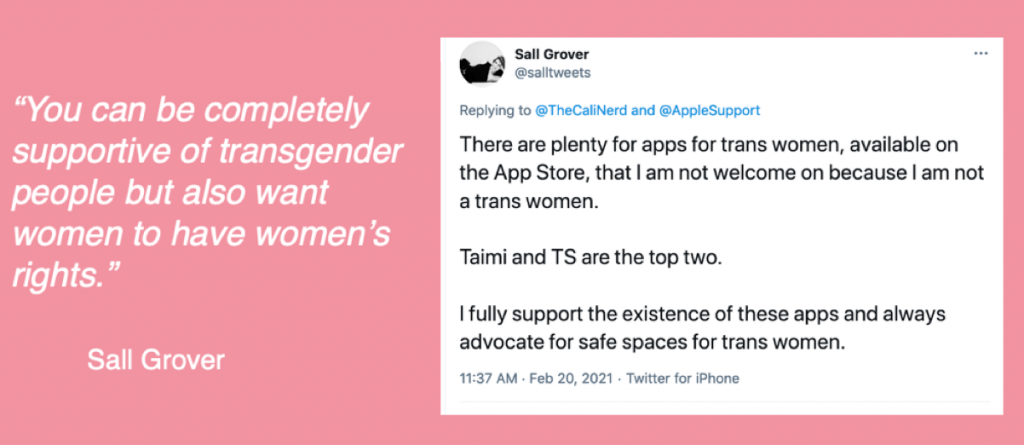“I don’t have a choice in how misogyny is dealt to me. I can’t Self ID out of it.” tweeted Grover in July 2020.