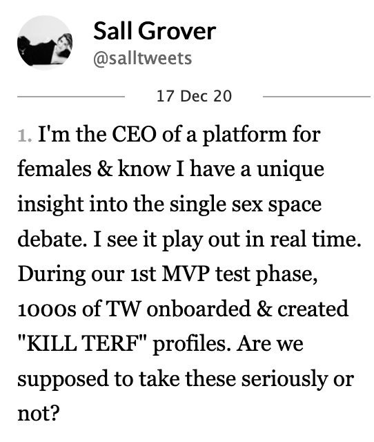 I was involved on the fringes of this Twitter discussion few days ago. Someone said that, in the small print, giggle said they did admit trans-identified men aka transwomen. Someone else said they thought they used to but they didn’t anymore.