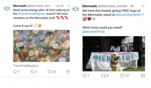 Mermaids has received funding from both the ‘National Lottery’ and ‘Children in Need’ and is to be found at PRIDE marches and events, offering children bags of sweets and cuddles with a cute puppy.