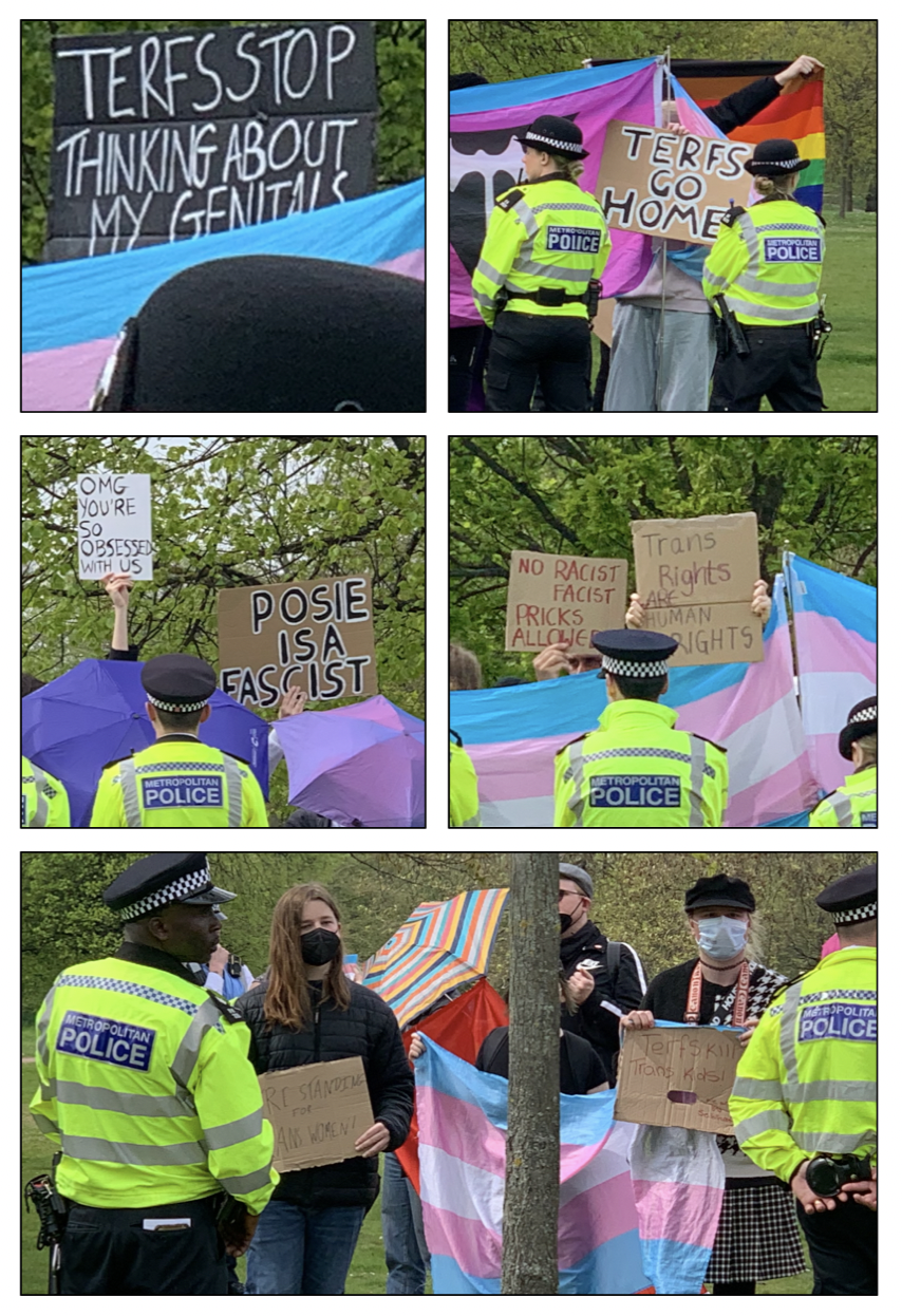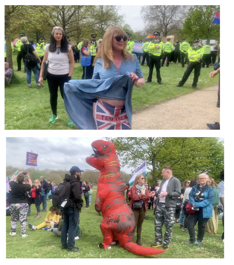 Initially I was near the front of the ring that gathered around Kellie-Jay and the livestream cameras. When the applause died down, she encouraged us to move the entire circle a little further away from the TRAs, leaving them in what she called ‘a literal and metaphorical time out’. After asking how many people were there for the first time – a surprisingly large number of people raised their hands- she led the group in a chorus of ‘It’s Almost like Being a TERF’.